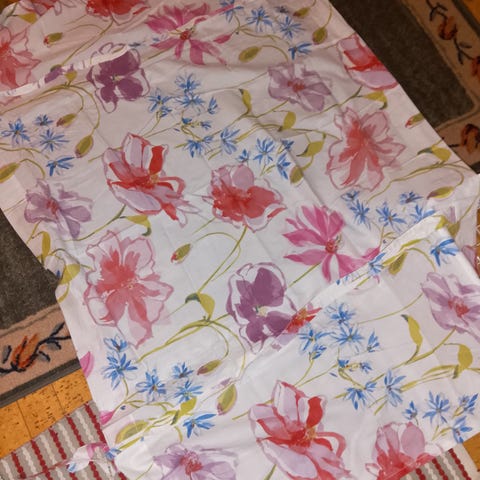 Ompelijalla teetetty laskosverho, koko 170x70. Takana on tarranauha ja rypytyskuja. Verho on ovenpäällä pitkittäin. Ikkunaan tulee toisinpäin.