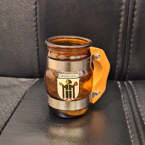 Keraaminen oluttuoppi, jossa metallinen kansi. Tuopissa on Bayern-tekstillä varustettu vaakunakuvio. Tuopin väri on vaalea, ja se sopii käytettäväksi oluen tarjoilussa tai keräilyesineenä. Ostettu Saksasta.