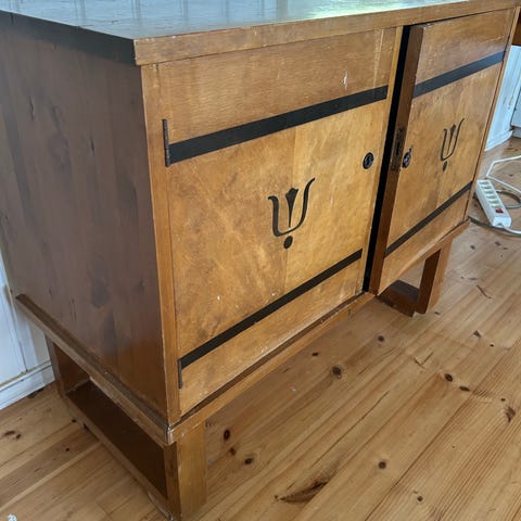 Vanha, painava, ruskeaksi maalattu kaappi sivuhyllyillä.