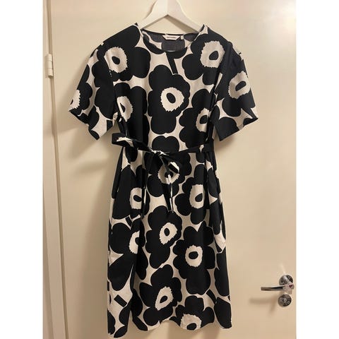 Myydään aivan ihana Marimekon mekko syksyyn ja talveen. Ostettu alkujaankin liian pienenä, koko on M, mutta mitoitus on niukka. Kai-kai 47cm, olka-helma 115cm. Kerman värinen/tosi vaalea beige. 56% villaa ja 44% viskoosia.