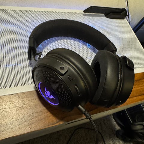 Razer Kraken Pro V2 on vihreä, johdollinen pelikuuloke, jossa on pehmustetut korvakupit ja säädettävä panta. Kuulokkeet on suunniteltu tarjoamaan mukavuutta ja selkeää ääntä pelikäyttöön.