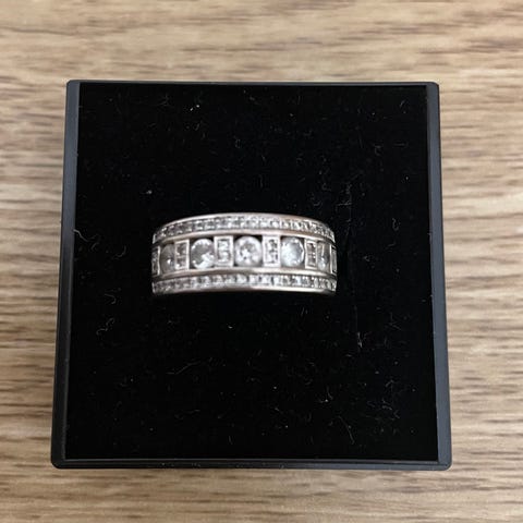 Myynnissä upea hopeinen kivisormus. Leveä sormus jossa monessa rivissä kiviä.