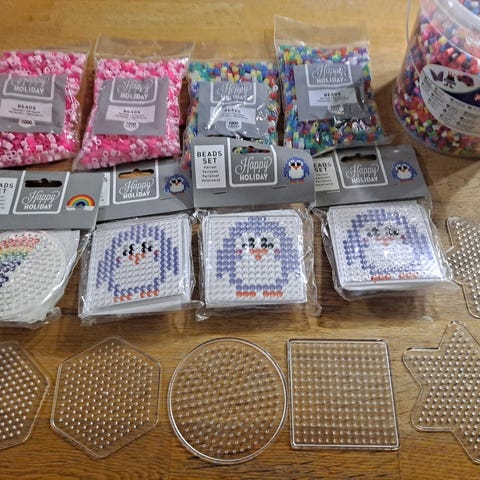 - 2 kpl pientä jouluaiheista hamahelmisettiä, joissa mallikuva, alustat ja tarvittavat hamahelmet erikseen pussissa.