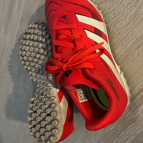 Adidas Predator jalkapallokengät, koko 33, musta ja punainen väri. Materiaali kestävää ja joustavaa kangasta, joka tarjoaa tukea ja mukavuutta pelatessa.