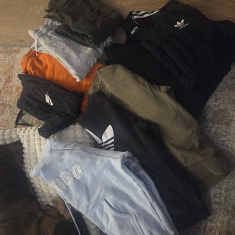 *Ruskeat housut 36, mustat S, siniset 26/32. Mustat näistä pienimmät. Niissä myös reidessä jälkeä. Muut hyväkuntoiset.