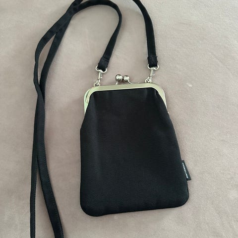 Marimekon musta käytännöllinen pikkulaukku. Koko pituus 18 cm. Leveys alareunasta 14 cm & yläreunasta 12 cm. Pitkä olkahihna 125 cm, joka mahdollistaa monipuolisen käytön, joko olka tai crossboby laukkuna