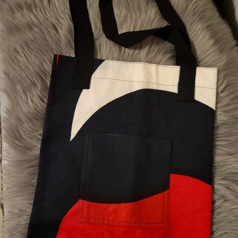 Marimekko Kangas kangaskassi, unisex-malli. Materiaalina kestävä kangas, luonnonvaalea pohjaväri ja punaiset painetut kirjaimet. Sopii arkipäivän käyttöön ja kevyiden tavaroiden kantamiseen.