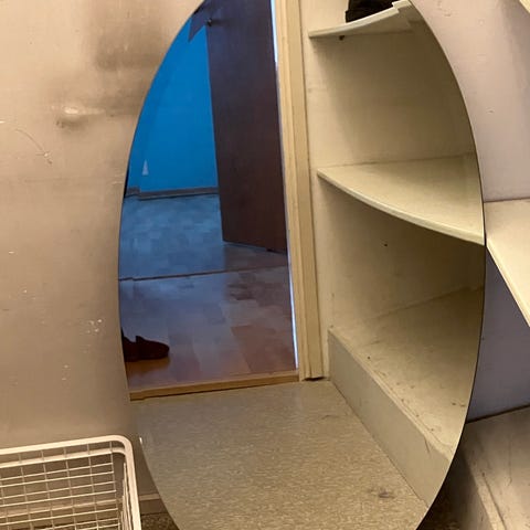 Isohko peili. Koko 140x50 cm. Peili on noin 1960-luvulta, mista kertoo kuvioitu puureunus ylä- ja alalaidassa. Peilin koko mahdollistaa koko vartalon näkyvyyden.