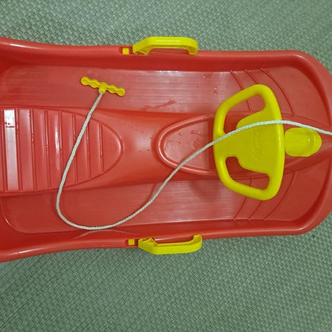 Dino aiheinen kahden istuttava rattipulkka. Metallijaloissa vähän ruostetta, mutta ehjä pulkka.