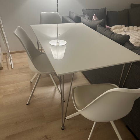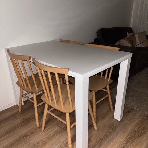 Myydään Ikean PINNTORP-pöytä ja ROSENTORP-tuolia, 4 kpl. Hintaan sisältyy MALINDA- istuintyynyt 4 kpl, beige värissä.