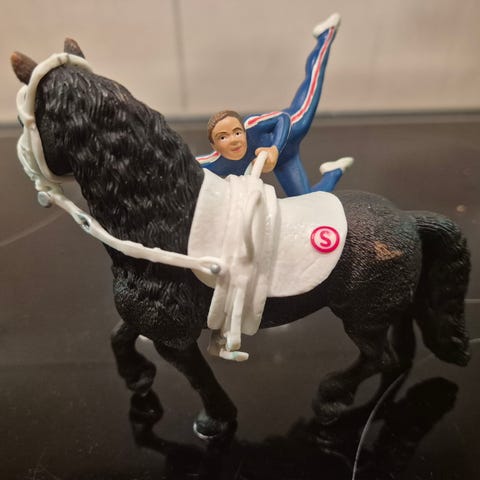 Hyväkuntoinen setti sisältää ratsun ja ratsastajan sekä kuvassa näkyvät varusteet