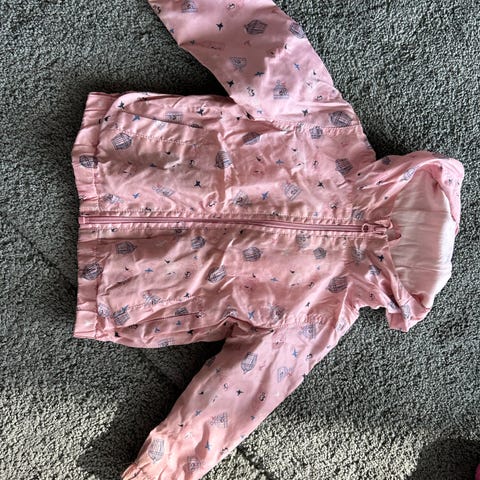 Next lasten tuulitakki, koko 80cm (vastaa kokoaan). Ehjä ja siisti, vähän käytetty toisen takin ohella. Ei tummentumoa tai tahroja. Ohut puuvillavuori. Huppu ei irrotettavissa. Kuvioitu kuosi sisältää eläin- ja kasviaiheita.