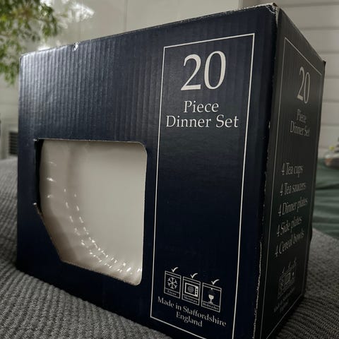 Kukka-aiheinen astiasto 4 hengelle, 20 osaa. KUPPI n. 1,5dl, 4kpl, suuaukon halkaisija/korkeus n. 8cm, leveys korvan kohdalla n. 11cm. KUPIN pyöreä ALUSLAUTANEN, 4kpl, ulkoreuna lievästi aaltoileva, halkaisija n. 14,2cm, korkeus n. 2,3cm. Pyöreä LEIPÄLAUTANEN, 4kpl, halkaisija n. 17,5cm, korkeus n. 1,6cm. Pyöreä SYVÄ KULHO, 4kpl, halkaisija n. 16cm, korkeus n. 4,2cm. Pyöreä RUOKALAUTANEN, 4kpl, ulkoreuna lievästi aaltoileva, halkaisija n. 25,4cm, korkeus n. 1,8cm. Astioiden sisä yläreunan pinta lievästi "aaltoilee", kuppien pohja kuvassa näkyy parhaiten kuvio. Käyttämätön. Pohjassa merkintä Churchill, valmistettu staffordshire englanti , kestää mikroaaltouunin ja astianpesukoneen.