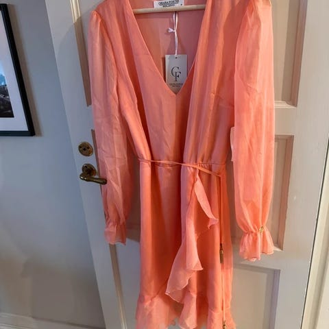 Modelia juhla- tai cocktailmekko naisille, koko 42. Mekossa on oranssiin ja pinkkiin painottuva monivärinen kukka- ja lehtikuviointi. Pyöreä pääntie ja 3/4-pituiset hihat. Valmistettu Suomessa. Sopii juhla- ja tilaisuuskäyttöön.