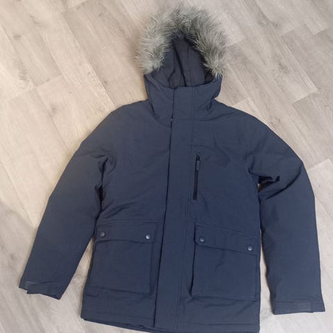 Toppatakki jossa useita eri vetskaritaskuja, huppu kiinnitetään neppareilla.