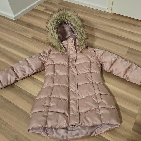 Lasten vadelmainen toppatakki, koko 128-134 cm, suunniteltu tytöille. Takissa on hupullinen malli, vetoketjukiinnitys ja kaksi vetoketjutaskua. Sisävuori on musta ja materiaali on lämpöä eristävää, soveltuu kylmempään säähän. Lämmin talvitakki . Ei ole ohut