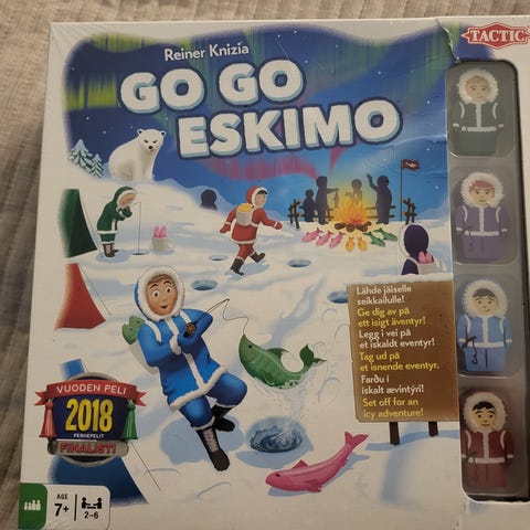 Go go eskimo- lautapelissä kuljet polkua pitkin nuotiopaikalle ja yrität kerätä mahdollisimman paljon kaloja. Ikäsuositus 7+ mutta sopii hieman nuoremmallekin pelaajalle.