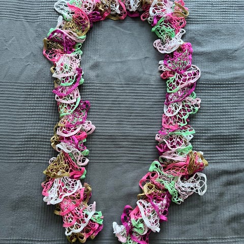 Itse tehty vaaleanpunainen kaulahuivi.