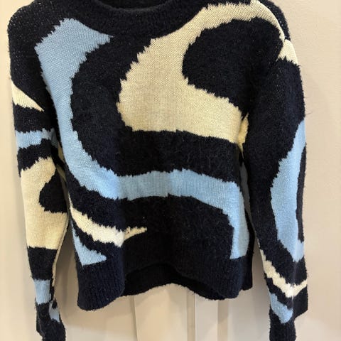 Myydään VeroModan neulepusero, koko XS. Puserossa on musta ja valkoinen raidoitus.