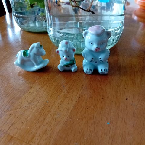 Nallemummo pitsihameessa, pituus n. 24-25 cm. Pää, kädet ja jalat posliinia, hame, pusero ym. kangasta, täytetty vanulla tms. täytteellä. Siisti ja ehjä, ei leikitty, pidetty vain koristeena. Käsiä ja jalkoja voi hieman liikutella. Karhun tarkkaa alkuperää en osaa sanoa, itä-eurooppaa veikkaan.