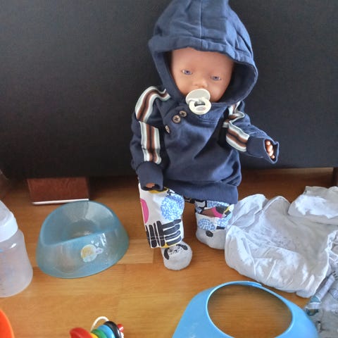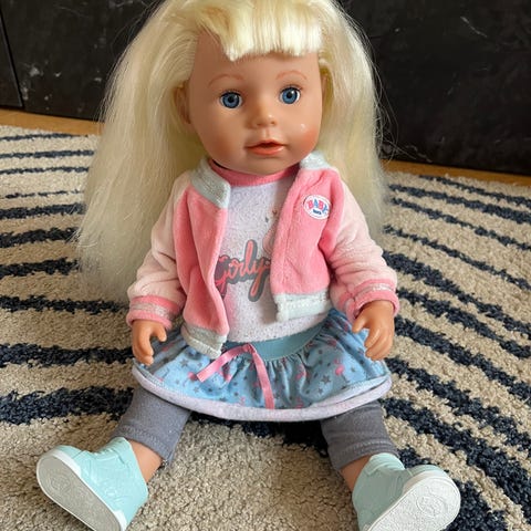 Hyvässä kunnossa, kovin vähäisesti leikkeihin mukaan päässyt nukkevauva seuraavalle. Mukaan tulee nuken päällä olevat vaatteet ja harja. Housut, huppari ja harja tullut aikoinaan nuken mukana. Paita ostettu joltain käsityö harrastajalta.