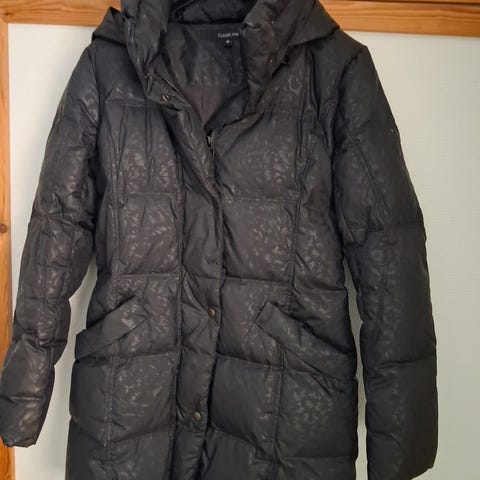 Tummansininen untuvatakki. Käyttämätön ja siisti, mutta toisen taskun saumat on teipattu, jottei untuvat vuoda. Ei ole siis rikki, mutta teipattu. Kokomerkintä XL, mutta vastaa ennemmin kokoa M.