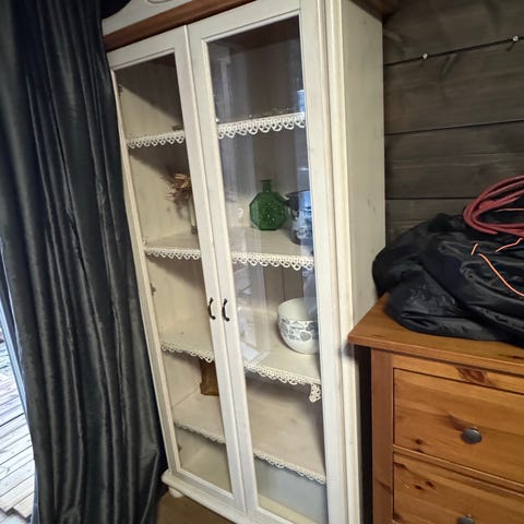 Vitriini täynnä muistoja Kemikaliokaupan vuosilta. Ihana sisustus elementti ja sisälle voi laittaa esille korut ja tai shamppanjalasit.