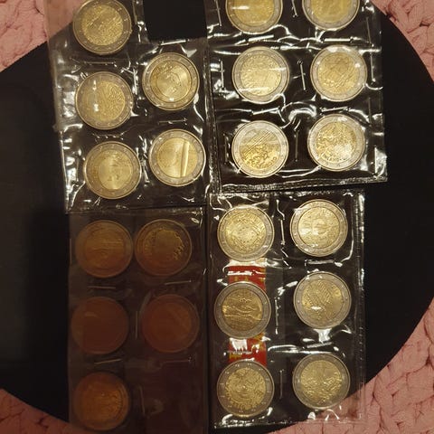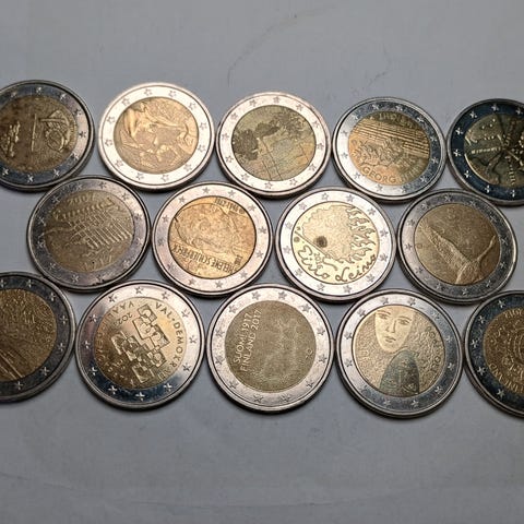 Kuvan 2e juhlarahat Viro 2002-2012, Italia 2002-2012. Kreikka 2004 Olympia. Saksa 2018. Kypros 2002-2012. Kierrosta.