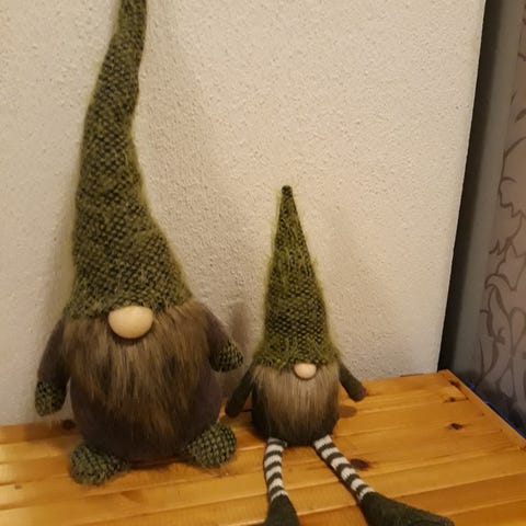Tämä suloinen sisustushahmo on valmistettu pehmeistä, laadukkaista materiaaleista ja huokuu kotoisaa tunnelmaa. Sen tunnusomainen piirre on pitkä, pörröinen, ruskea hattu, joka ulottuu lähes maahan asti, peittäen tontun silmät.