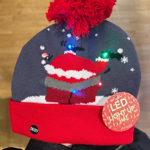 Yksityiskohdat: Pipossa on kirkkaanpunainen taitettu reuna ja tupsu. Reunassa on pieni ON/OFF-kytkin, jolla voit ohjata valoja. Toisessa kuvassa näkyvä tuotelappu vahvistaa kyseessä olevan LED Light Up Hat.