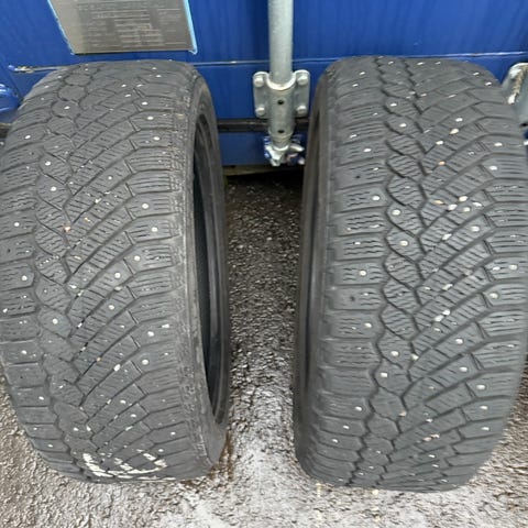 Continentalin nastarenkaat joissa nastat pääosin tallella ja pintaa 5mm-6mm.