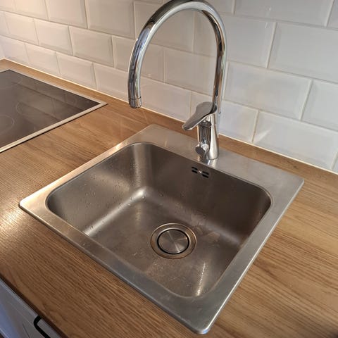 Keittiön allas ja hana ruostumattomasta teräksestä, yhdistettynä puisiin työtasoihin. Allas on sijoitettu vasemmalle ja hana keskelle allasta. Työtasot ovat puupintaiset ja vaaleanruskeat. Sopii keittiön pesu- ja valmistelutilaksi.