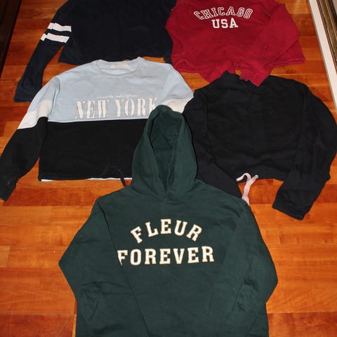Siistikuntoinen vaatepaketti 146/152cm tytölle: 3 kollegepaitaa ja 2 muuta pitkähiaista paitaa sekä 2 alustoppia. Valkoinen offshoulder paita on todella kaunis vaikka juhlaankin.