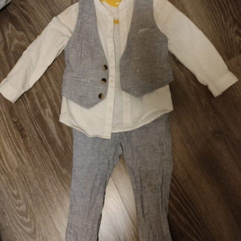 Myydään lasten puku johon kuuluu; takki, housut, liivi ja 2 kauluspaitaa,