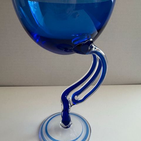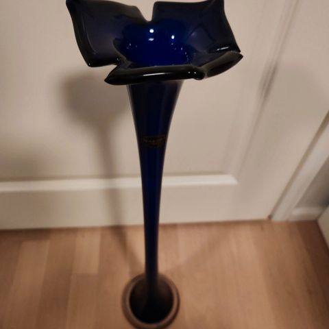 Makora Poland käsintehty lasinen maljakko/vaasi, jossa luumunvärisellä pinnalla sininen kuvio molemmin puolin. Korkeus noin 20 cm, leveys leveimmillään noin 13 cm. Mitat kuvissa joka puolelta. Ovaalin muotoinen. Toisessa yläreunassa pieni hankausjälki (viimeinen kuva), muuten ehjä kaikin puolin.
