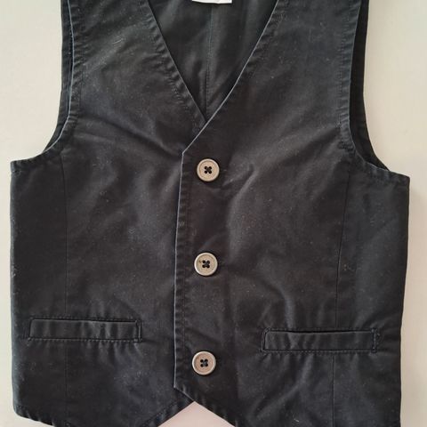Musta lasten liivi juhliin. Koko lapussa 98, mutta muistelen olleen reilumpi mitoitus. Selässä silkkimäinen kangas ja kiristyssolki pienellä säätövaralla.