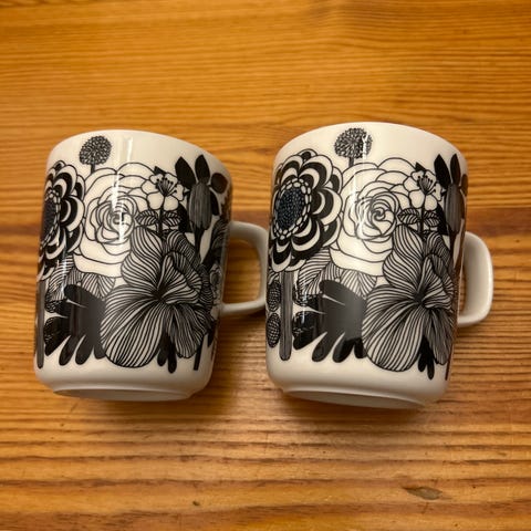 Uudet Marimekko Oiva Siirtolapuutarha mukit. Väri musta harmaa. 2 kpl hinta yhteensä 40,00 euroa.