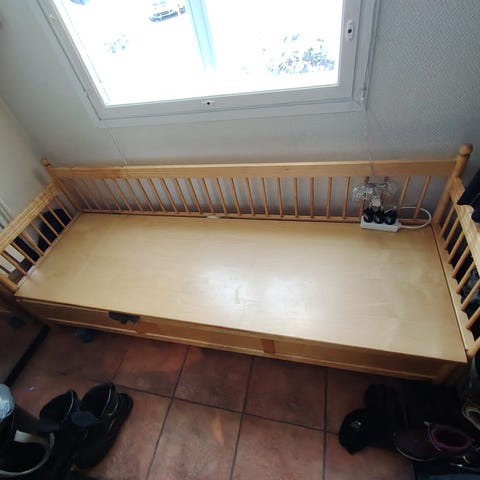 Hyväkuntoinen puusohva. Saa levitettyä vuoteeksi. Kankaat helppo vaihtaa mieleiseksi.