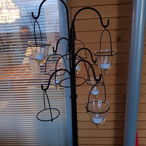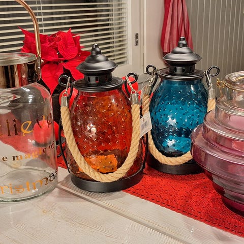 Myydään punainen lasilyhty. Lyhdyn korkeus 38 cm ja halkaisija 22,5 cm. Suht painava.