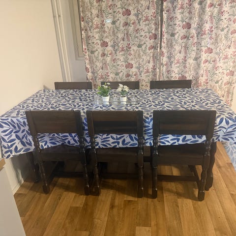 Pöytä ostettu ikeasta on hyvässä kunnossa, tuolit ostettu muistaaksenj jyskistä ovat käyttökuntoiset.