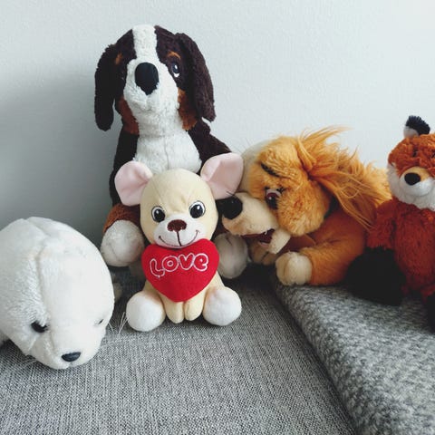 Kolme pehmoa. Valkoinen hylje on aivan uusi, essupehmo on ollut jonkin verran leikeissä mukana ja pienin pehmo helisee.