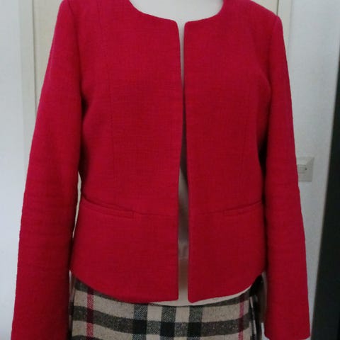 Luonnonvalkoinen, kauniisti istuva jakku irrotettavalla turkiskauluksella. Eli voi käyttää kahdella tavalla; kauluksella tai ilman kaulusta. Kaunis solki pitää jakun kiinni. Koko on 42. Olen säilyttänyt jakkua komerossa suojapussissa.