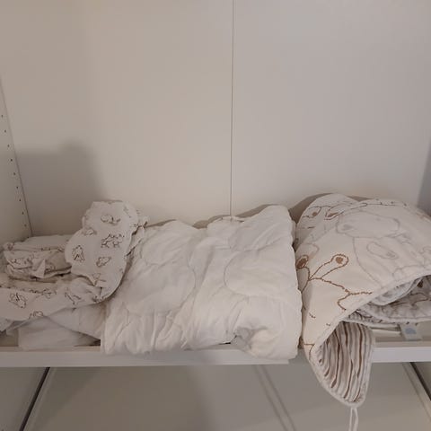 Itsetehty lasten sisustustekstiilisetti, joka sisältää lakanan, pussilakanan, tyynyliinan, päiväpeitteen, pinnasuojan koko sänkyyn, katokseen verhot. Pehmeää puuvillaa. Pastellinsävyjä ja pilkkukuoseja. Peruskokoja.