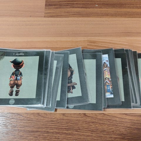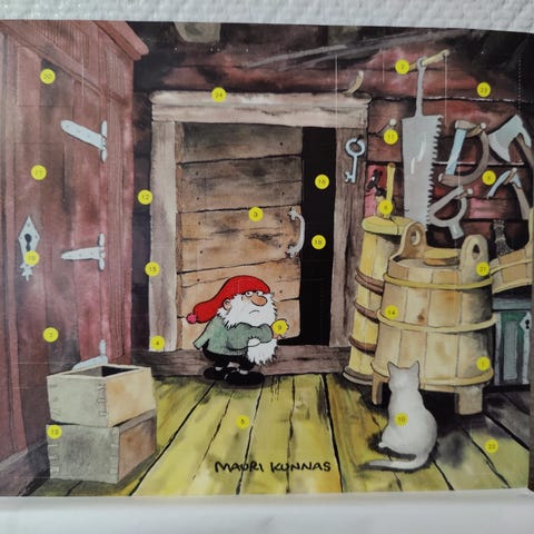 Joulu-aiheinen joulukalenteri, jossa on kuvituksena tonttuja ja vuohia lumisessa maisemassa. Kuvitus sisältää perinteisiä jouluelementtejä, kuten tonttulakit ja joulupukin hahmoja. Kalenteri sisältää luukut numeroituna 1-24, tarkoitettu joulunodotukseen.