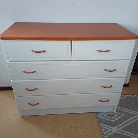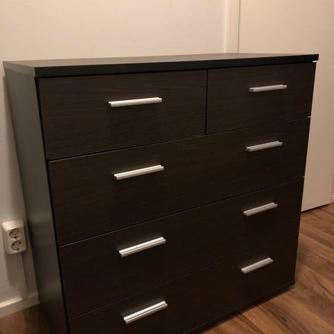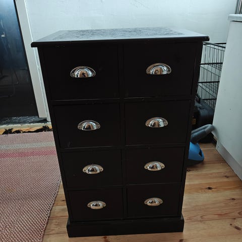Lipasto kolmella laatikolla, takana alhaalla reikä sähköjohdolle.