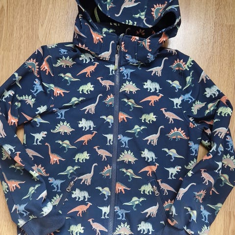 H&M tummanlila softshell takki 140cm. Yleisilmeeltään todella siisti, mutta tarkemmin katsottuna vähän tummentumaa kauluksessa ja tahra toisessa kyynärpäässä. Vetoketjulliset sivutaskut, hihansuissa tarrakiristykset ja huppu on kiinni neppareilla eli sen saa pois. Hinta 3e