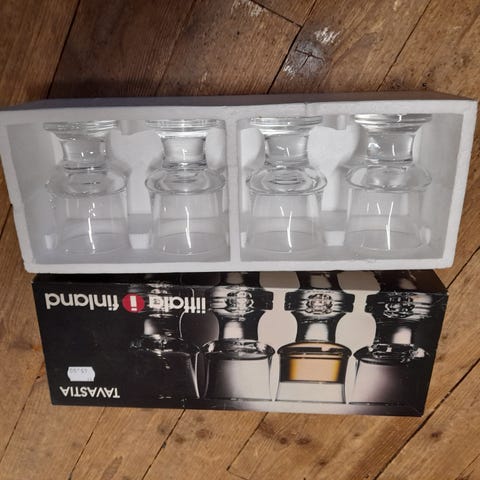 Iittala Timo Sarpaneva Kekkerit -lasit. Settiin kuuluu 12 kpl 7 cm ja 9 cm laseja ja 2 kpl 14 cm laseja. Lisäksi Aslak-sarjan snapsilasit 6kpl. Toinen isompi setti Wirkkalan Tapio laseja, eri kokoja. Myös Kippis sarjan grogilaseja 6 kpl. Hinnat 10-25 euroa kpl.