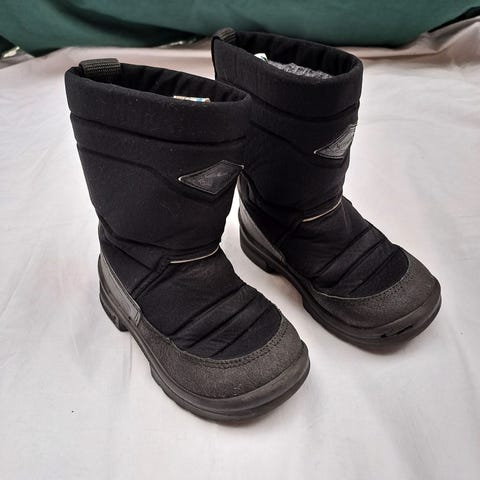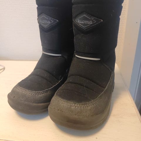 Mustat Kuoma talvikengät, koossa 27. Kunto kohtalainen, sisävuori mennyt kantapäiden kohdalta puhki. Toimii hyvin villasukkien kanssa.