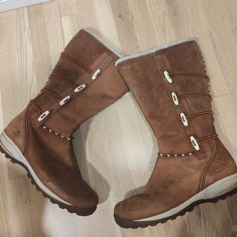 Viking Saappaat koko 39, ruskeat, valmistettu nahasta. Saappaissa on vetoketju sivussa ja koristeelliset nauhat sekä napit. Pohja on kumia, joka tarjoaa hyvän pidon. Sopivat käytettäväksi kylmempinä vuodenaikoina.