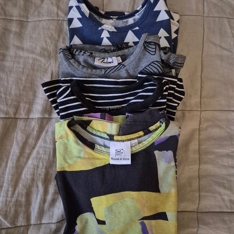 Pitkähihaisia paitoja 6kpl, kaikki 110-116 kokoisia. Merkkeinä H&M, Lindex ja Mayoral. Käytettyjä on, osa ihan siistejä, molemmissa paljettipaidoissa tahroja. Heppapaljetti paidassa pieni reikä edessä. Mutta ihan käyttökelpoisia vielä vaikka päiväkotiin tms.